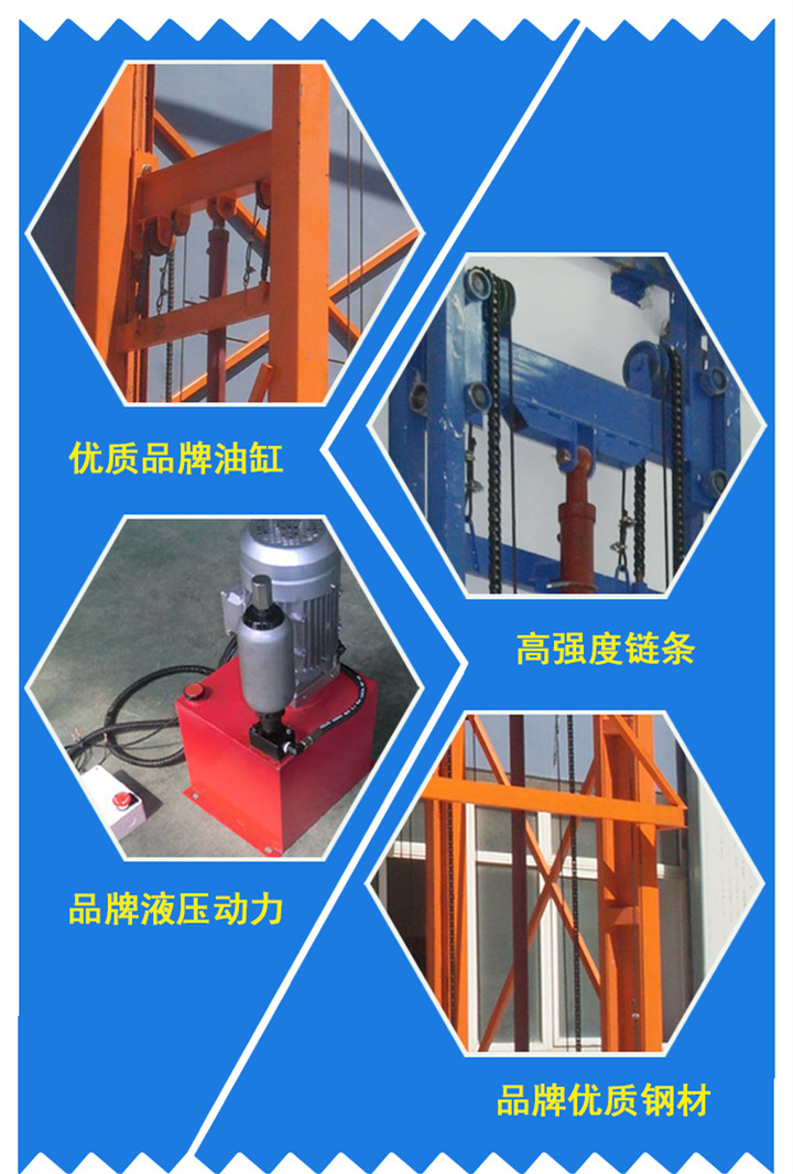 最大承載10噸,實現多(duō)點控(kòng)製,上下樓層互動(dòng)聯鎖,達到安全使用;提升高度高,采用旁置油缸、或雙測式油(yóu)缸,運(yùn)行平穩、無噪聲、維修方便,如果速度要求過高,采用進口定製泵站(zhàn),達到理想的送貨要求,密封件(jiàn)采(cǎi)用進口零部件,解決(jué)客戶(hù)油壓不穩定,零部件漏油問題,電器零部件可(kě)選。移動(dòng)升降平台(tái) 液壓升(shēng)降貨梯 導軌式升降機 www.syjzjj.org.cn 濟南宇(yǔ)軒升降機(jī)械有(yǒu)限(xiàn)公司(sī)。
