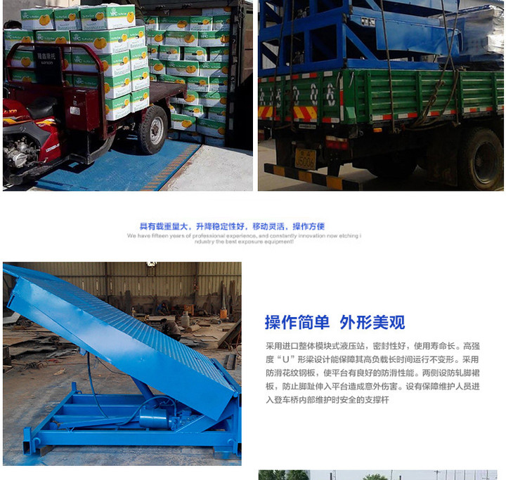1.電控操作(zuò)隻需按動按鈕(niǔ),調節板會自動升起,操作極其簡單;鬆開(kāi)按(àn)鈕,調節板靠自重下降,活頁搭板搭在貨車上即(jí)可使用。