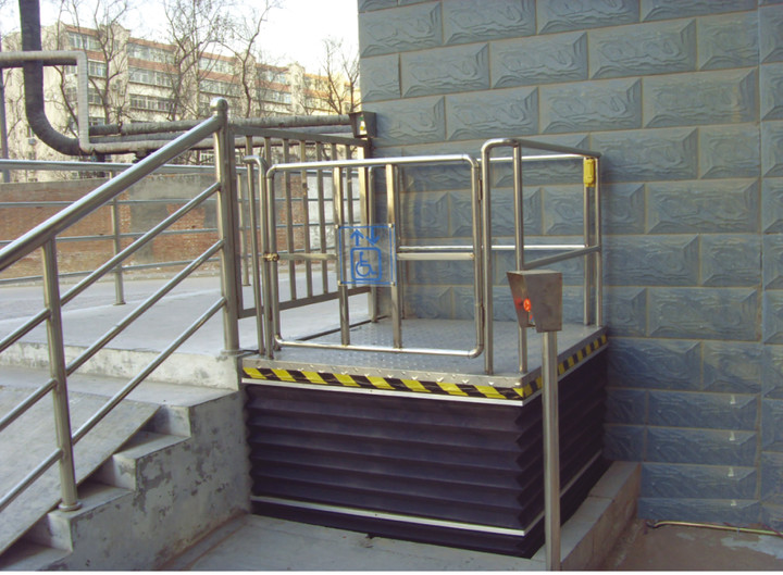 無障(zhàng)礙升降平台由導軌和驅動箱等三大部分組成(chéng);由C型(xíng)鋼材為主(zhǔ)體部件,采用“翹板自複位開關操作運行”, 無基坑式安(ān)裝,直接固定於混凝土地麵(無底坑室外應用情況下(xià),平台下方混凝土地麵不得低於周圍地麵) ,手動液壓閥打開時升降底板能(néng)手動下降(jiàng);液壓驅動,升降平穩安全,外部采用拉(lā)絲不鏽鋼材料和鋁板靜電噴(pēn)塑機箱(xiāng)/麵板,外形小(xiǎo)巧(qiǎo)美觀,不阻礙周邊環境。直接安(ān)裝於地麵,無(wú)需土(tǔ)建(jiàn)配套地坑,施工簡(jiǎn)便,產品放置戶外不易積水,不易生(shēng)鏽,維護簡便。