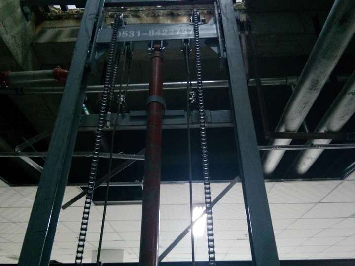 1、傳(chuán)動係統:主要(yào)由鏈條、鋼絲繩、導向輪、反繩輪組成。主要功能是輸出、傳遞動力,使導軌式升降機運行。